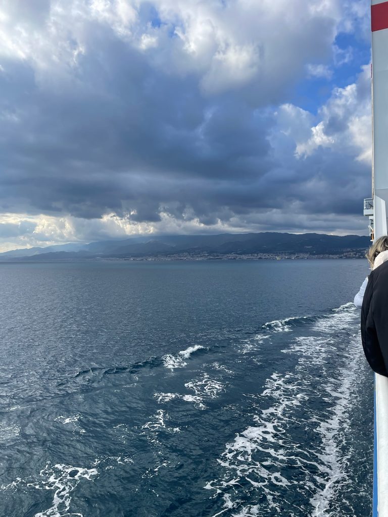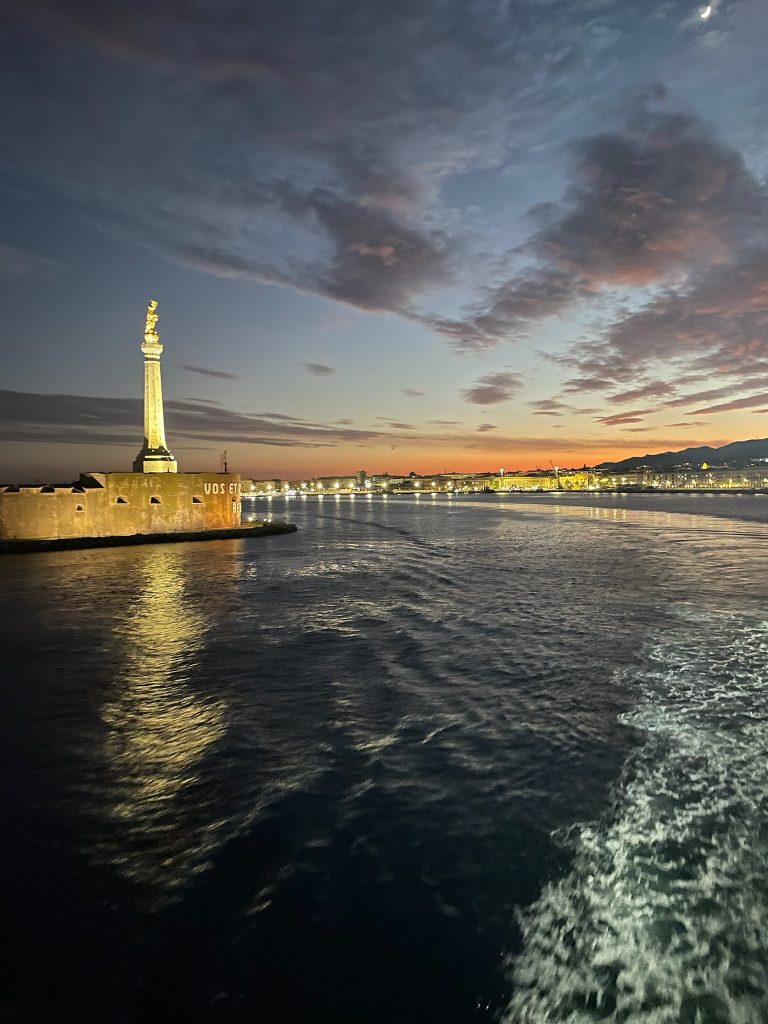 Gegen Mittag erreichen wir Villa San Giovanni. Hier wartet der Höhepunkt dieser Reise. Die Überfahrt nach Sizilien. Unsere Waggons werden langsam auf die Fähre geschoben. Wir steigen aus und holen uns im Bistro einen heißen Kaffee und eine Schokolade. Die Überfahrt über die Straße von Messina dauert rund 35 Minuten.