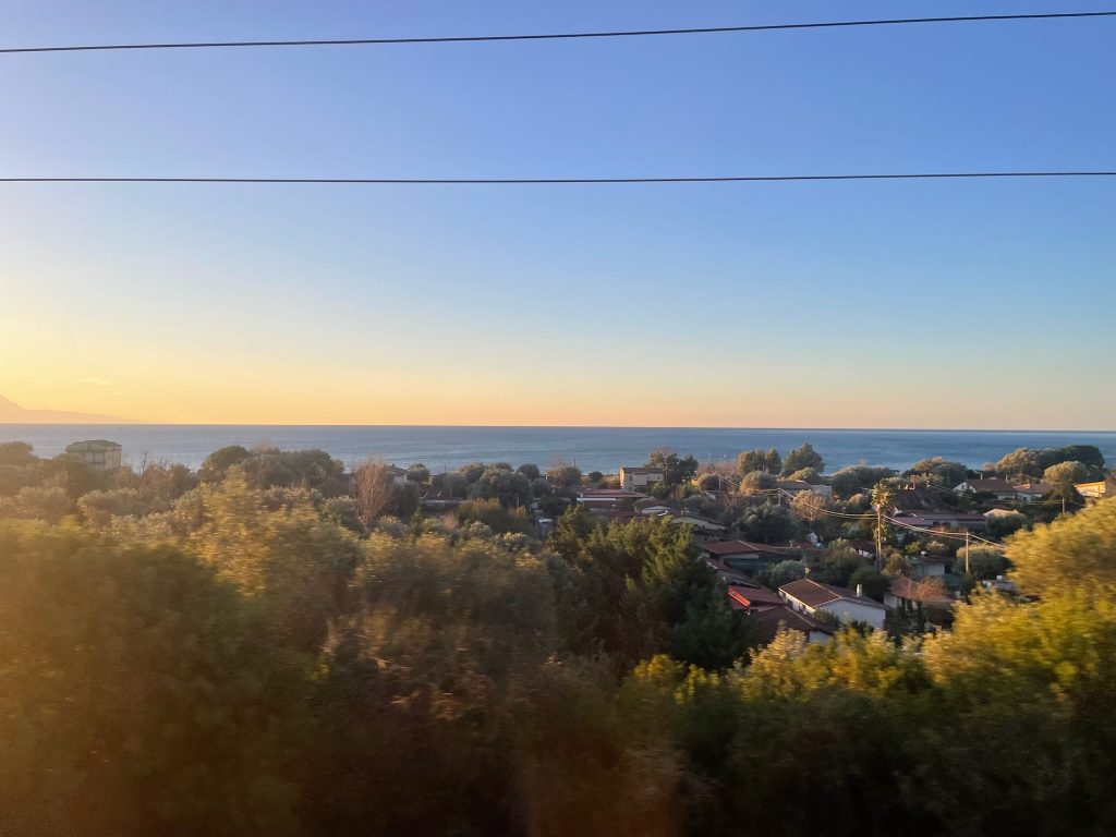 Irgendwann am Morgen, südlich von Salerno, ziehe ich die Jalousie hoch. Direkt vor dem Fenster liegt das Meer. Ruhig, türkisfarben, fast unwirklich. Palmen ziehen vorbei, kleine Küstenorte reihen sich aneinander. Für einen Moment fühlt es sich an, als wäre man nicht nur an einem anderen Ort, sondern in einer anderen Jahreszeit.