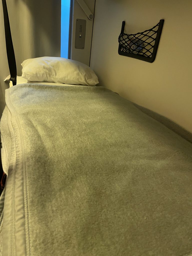 Der Liegewagen ist einfacher ausgestattet. Es gibt ein Laken, ein Kissen und eine Wolldecke. Eine vollständige Bettwäsche wie im Schlafwagen fehlt. Viele bringen sich deshalb einen eigenen Schlafsack mit. Ich komme auch so gut zurecht.